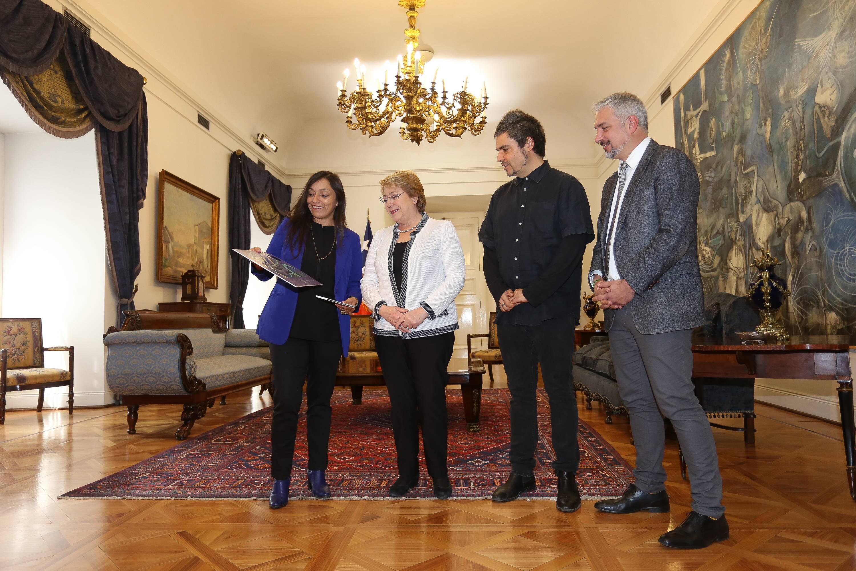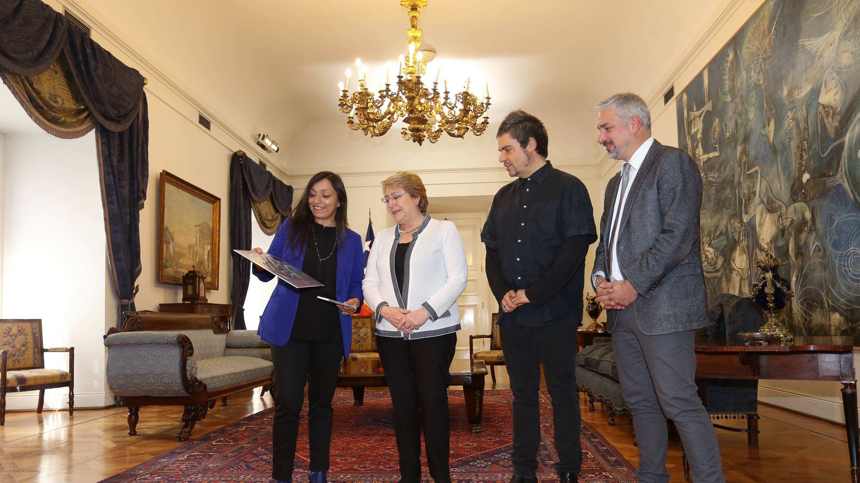 Los hermanos Ángel y Javiera Parra llegaron hasta La Moneda para reunirse con la Presidenta de la República, Michelle Bachelet, quien los recibió en una audiencia privada junto al Ministro de Cultura, Ernesto Ottone, en el marco de los 100 años del natalicio de su abuela, Violeta Parra. En la ocasión, los músicos le dieron a conocer su más reciente producción discográfica, “Las últimas composiciones de Violeta Parra”, disco financiado por el Consejo Nacional de la Cultura y las Artes (CNCA) y que forma parte de las más de 350 actividades conmemorativas de la gran creadora nacional.