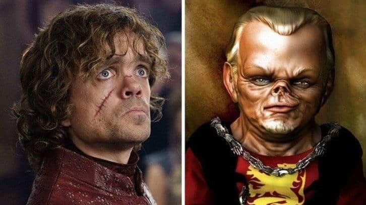 Uno de los personajes que se ve más diferente a la descripción suya en el libro es el favorito de todos, Tyrion Lannister, ya que durante la Batalla del Aguasnegras recibe un hachazo en la cara que le deja una marca más pronunciada, además de que a consecuencia de esto también pierde media nariz, cosa que no muestran en la serie.