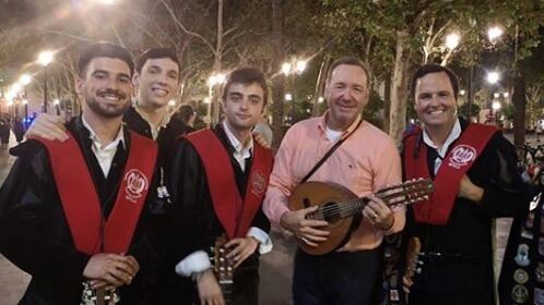 El actor Kevin Spacey, semanas atrás se le vio recitando poemas en Roma, Italia, pero bastante serio. El lunes por la noche, el grupo Tuna de Derecho de Sevilla, publicó varias imágenes con el actor, e incluso, un video (subido por diario El País), en que se le ve bastante jocoso cantando con ellos en la calle.