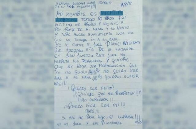 “Yo no quiero ver más a mi mamá. No quiero sufrir más”, es parte de la carta que ha calado hondo en Argentina, luego que una niña de diez años le escribiera a la gobernadora de Buenos Aires, María Eugenia Vidal, para pedirle ayuda.