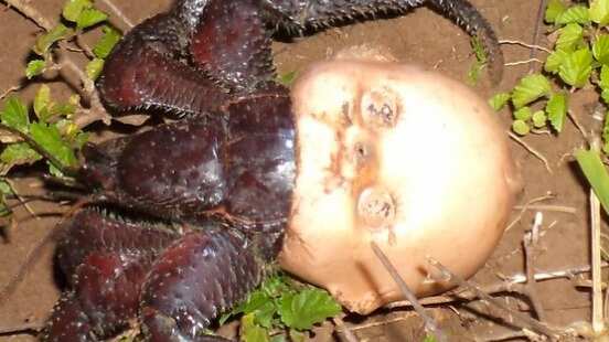 Lo cierto es que el animal, un cangrejo de coco, decidió usar la cabeza de goma como una forma de protección pese a la dura caparazón con la que cuenta y aún así terminó viéndose más aterrador de lo que ya es.