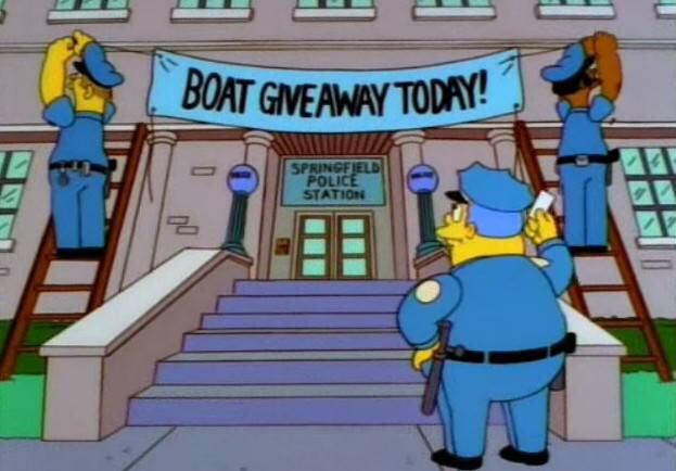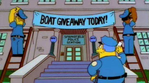 La historia termina con Homero retenido por los uniformados y obligado a pagar 233 multas de tránsito. Eso sí, antes de retirarse y luego de entregar el cheque, exige que le entreguen su lancha.