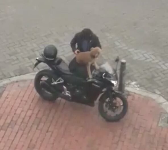 En el registro, que ocurrió en Bogotá (Colombia), se ve que un moticiclista sube al can a su moto y lo acomoda en una bolsa especial para llevarlo en el vehículo.