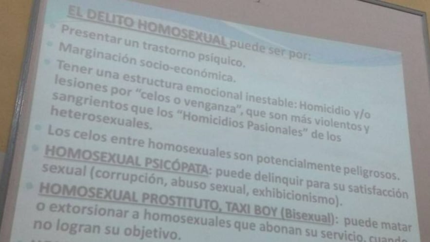En las diapositivas se señala que el “delito homosexual” puede ser por “presentar un trastorno psíquico, marginación socioeconómica y tener una estructura emocional inestable”.