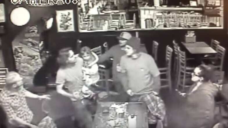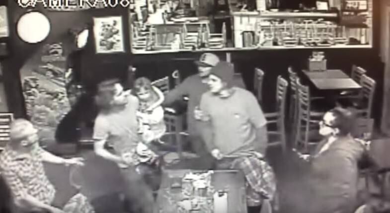 En las imágenes de la cámara de seguridad del restaurante Crossroads Pizza & Wings Bar se puede ver como Richard Warry Brown de 39 años encara a otro sujeto mientras dos mujeres tratan de impedir el pleito.