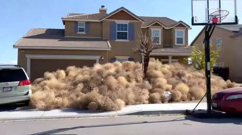 Las viviendas estaban prácticamente sepultadas por miles de plantas rodadoras, las que incluso llegaban hasta el segundo piso de las casas.