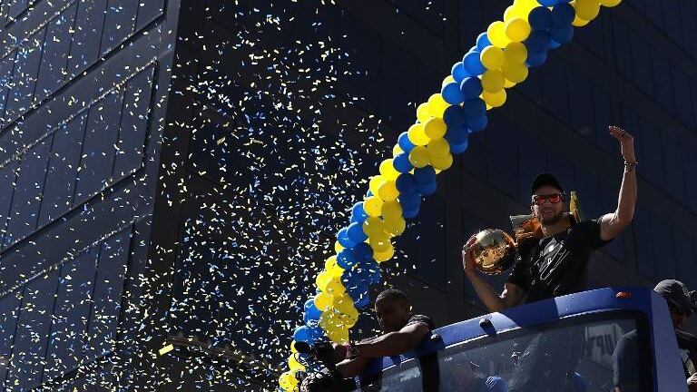Los seguidores de los Warriors se lanzaron este jueves a las calles para celebrar a sus ídolos, en los que se vieron espontáneos bailes callejeros, ruidosas caminatas y caravanas de automóviles cubiertos con banderas doradas y azules.