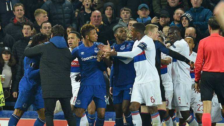 En un verdadero escándalo terminó el duelo entre Everton y Olympique de Lyon por la Europa League, luego de la trifulca que protagonizaron jugadores de ambos equipos dentro del campo de juego de Goodison Park, y que incluso involucró a algunos hinchas.