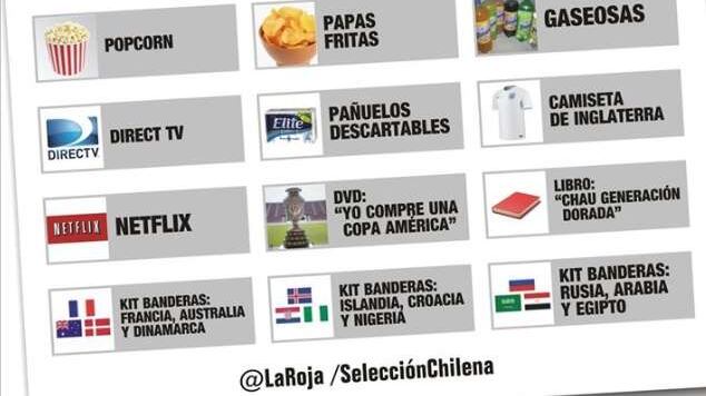 También aparece un dvd de «yo compré una Copa América» y kit de banderas de los rivales en la fase de grupo de Perú, Uruguay y Argentina, además de camisetas de Inglaterra.