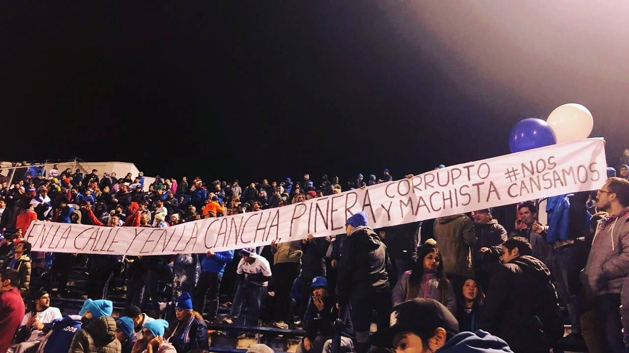 En la barra de #LosCruzados se sumaron a la protesta #NosCansamos1. La organización @NuestraCruzada exhibió este lienzo en la tribuna Mario Lepe durante el UC vs Independiente del Valle @ElGraficoChile pic.twitter.com/C2dRWWab24