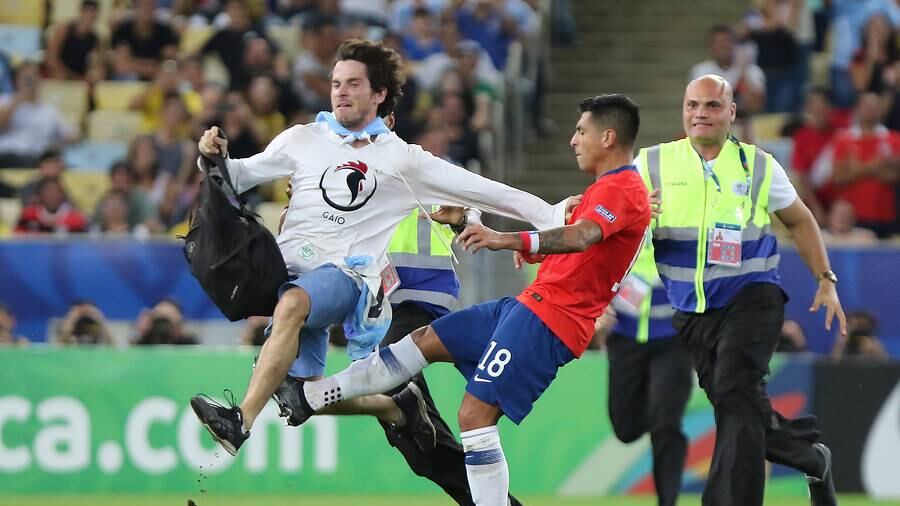 El fanático que invadió el terreno de juego del Maracaná corría para escapar de los efectivos de seguridad cuando fue embestido por el zaguero de la Selección con una fuerte entrada, lo que lo llevó a caer sobre el césped.