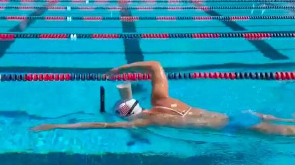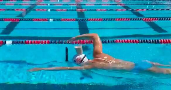 La nadadora estadounidense de 23 años sorprendió al cruzar la piscina nadando con un vaso de leche sobre su cabeza y sin derramar una sola gota.
