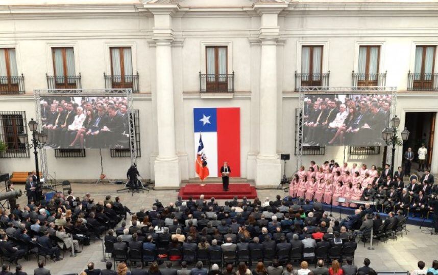 En el Patio de Los Cañones del Palacio de La Moneda, la Presidenta de la República, Michelle Bachelet, acompañada por los ministros del Interior y Seguridad Pública, Jorge Burgos; y de la Secretaría General de Gobierno, Marcelo Díaz, participó en la ceremonia de celebración del Día Nacional de las Iglesias Evangélicas y Protestantes de Chile.