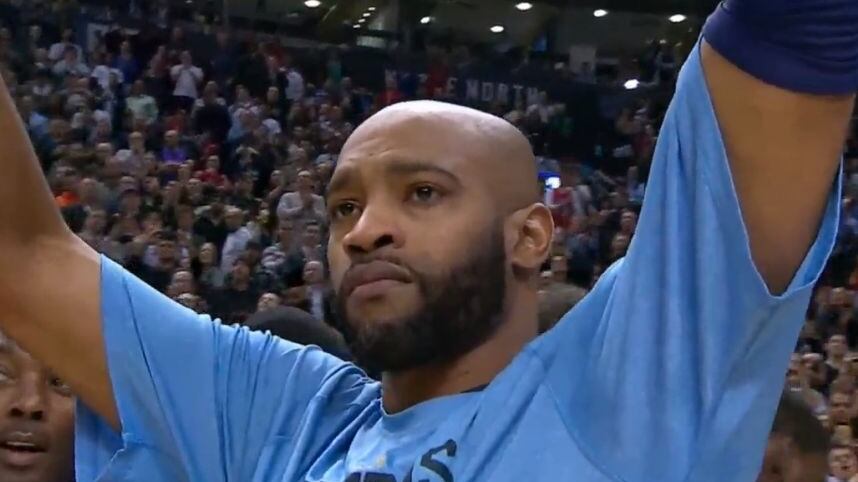 Vince Carter, basquetbolista estadounidense que actualmente milita en los Memphis Grizzlies, recibió un emotivo homenaje cuando visitó este miércoles el Air Canada Centre.