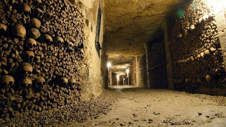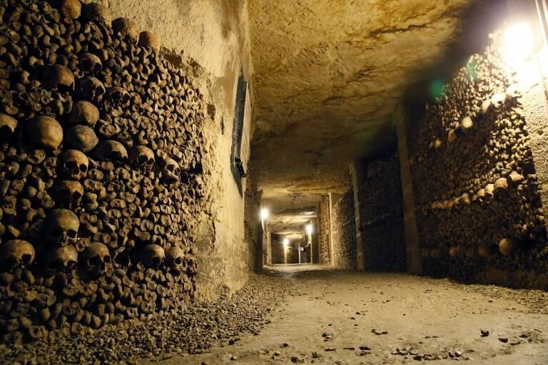 Las Catacumbas de París, una red de túneles a 20 metros bajo tierra, alberga los esqueletos de seis millones de parisinos, que fueron trasladados ahí entre finales del siglo 18 a mediados del 19, debido al exceso de restos humanos que llenaban los cementerios de la capital francesa.