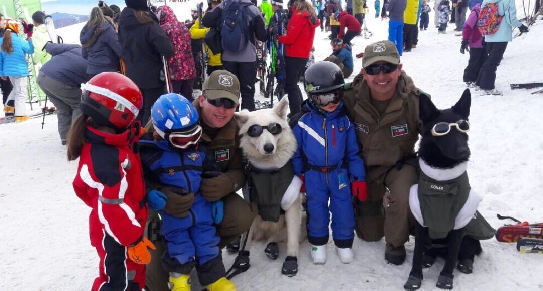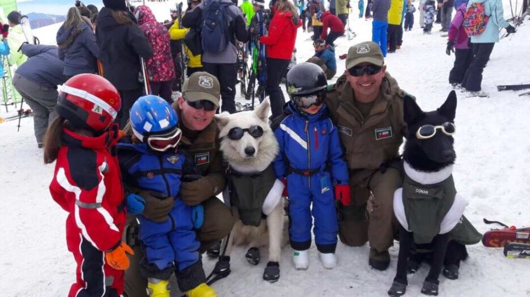 Botitas, chaquetas impermeables y lentes con protección UV. Así de abrigados y estilosos andan los perros de Carabineros que son parte del trabajo que hace la institución en los centros invernales del país.