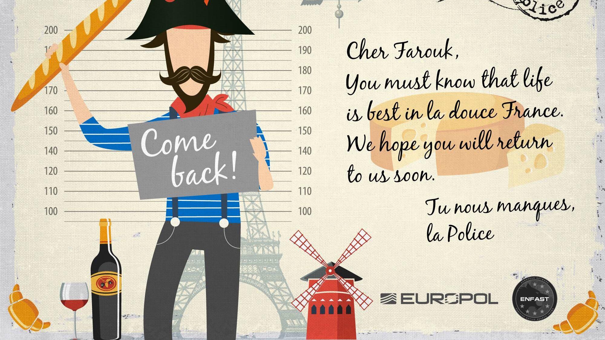 «Querido Farouk, ya sabes que la vida es mejor en la dulce Francia. Esperamos volver a verte pronto». Este es tan solo uno de los mensajes que contienen las postales lanzadas por las fuerzas policiales europeas en el marco de la campaña «¡Te queremos de vuelta este verano!» creada para apresar a los 21 criminales más buscados del continente.