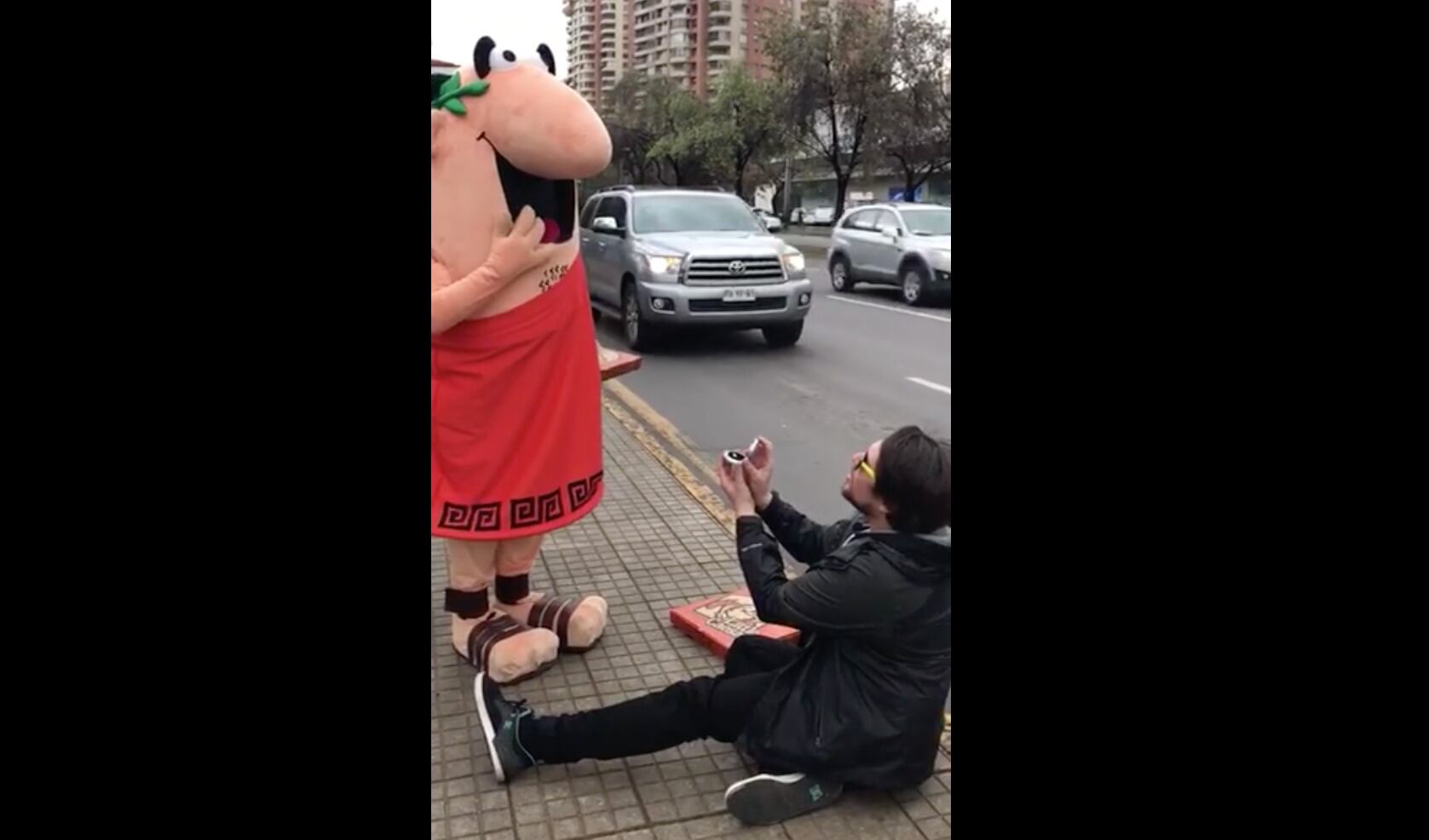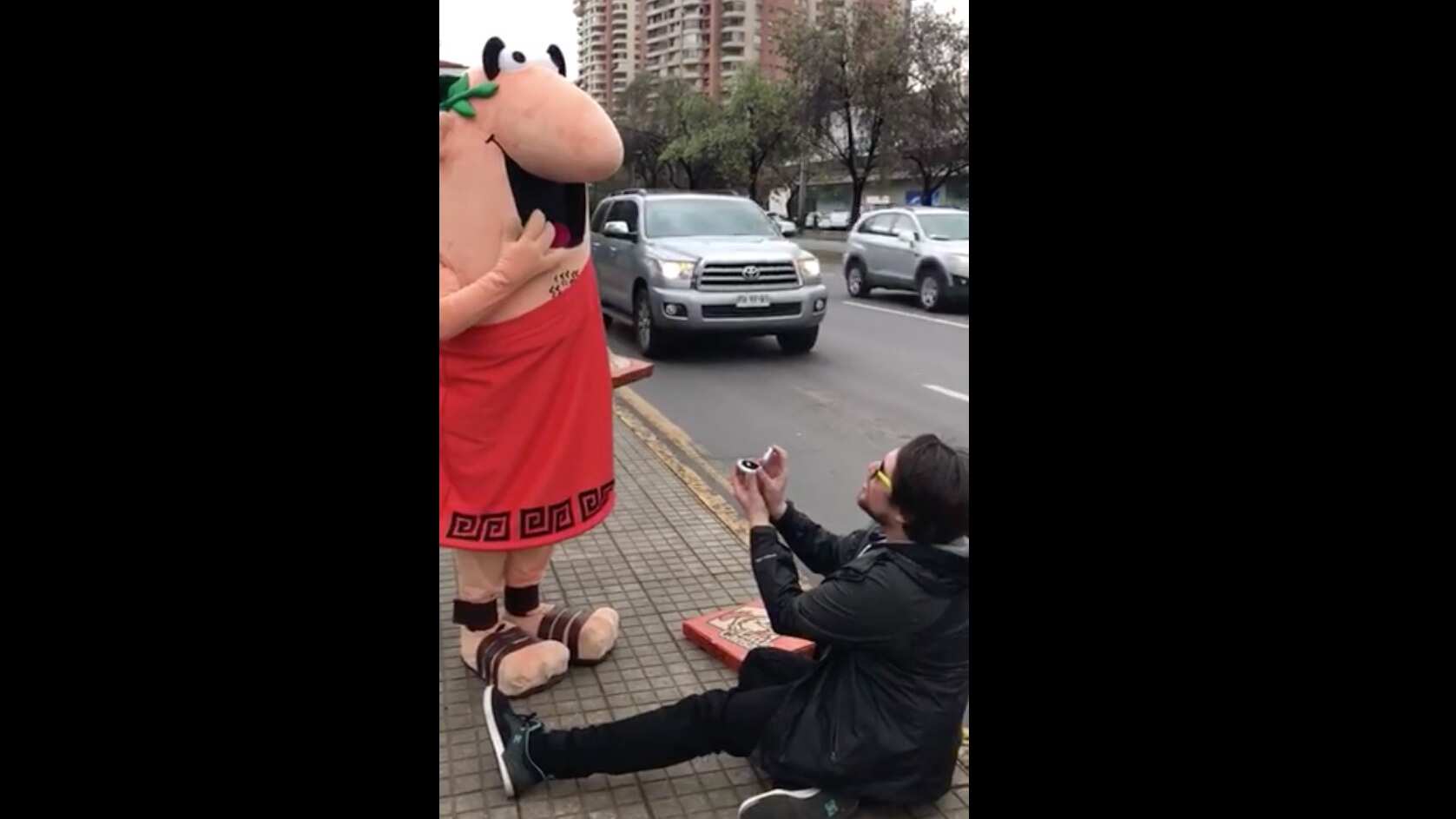 «Cásate conmigo, te amo, te elegí a ti, quiero estar contigo. Cásate conmigo Litle Caesars, dímelo bonito, dímelo con pepperoni!”, le dice un hombre al corpóreo de la marca en el video que se puede ver en la cuenta de Facebook.