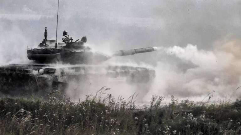 Centenares de tanques, casi invisibles bajo espesos camuflajes que los confunden con la vegetación se mueven en el terreno. Los apoyan helicópteros antitanque Kamov Ka-52 «Alligator», usados en Siria contra el Estado Islámico.