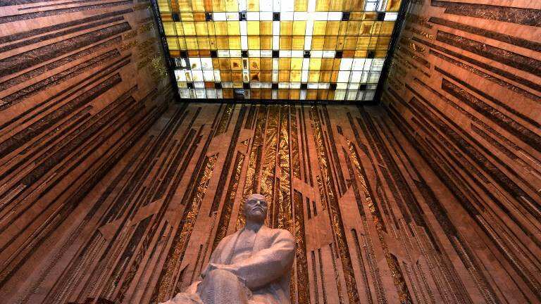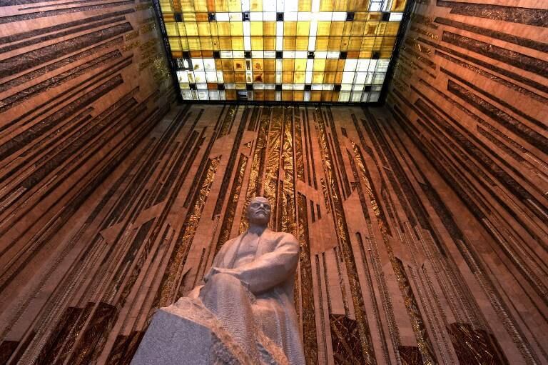 Dentro, las alfombras rojas cubren los 4.000 metros cuadrados de salas de exposición, donde los visitantes pueden observar una máscara funeraria de Lenin y admirar una inmensa maqueta de la URSS.