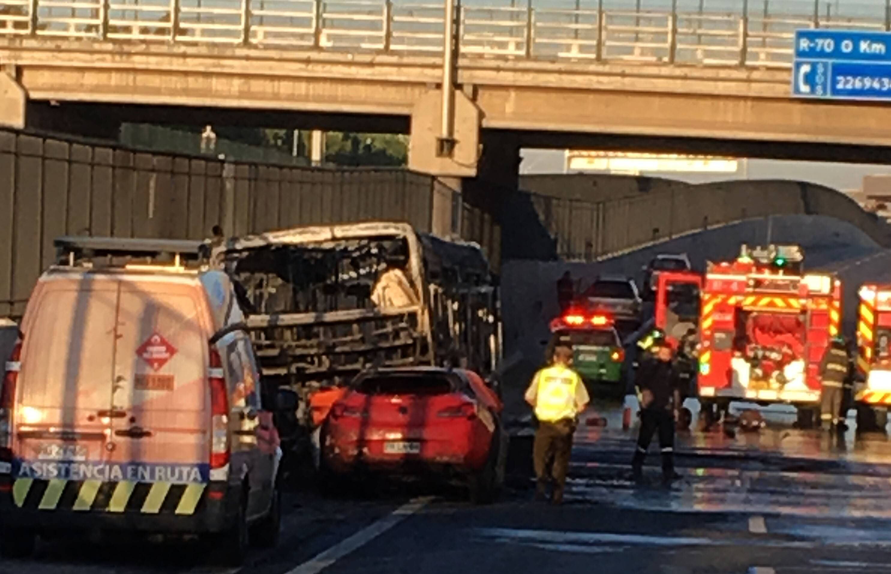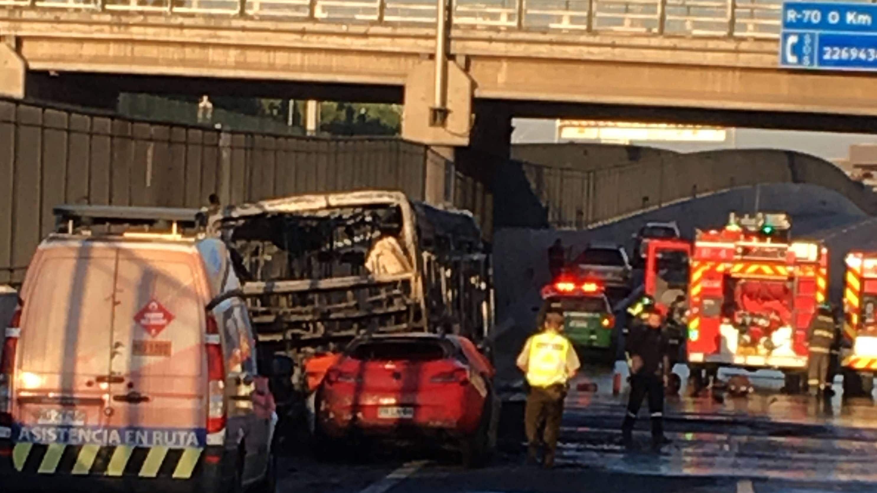 En tanto, su acompañante y el chofer del bus del transporte público lograron escapar de las llamas que afectaron a los dos móviles.