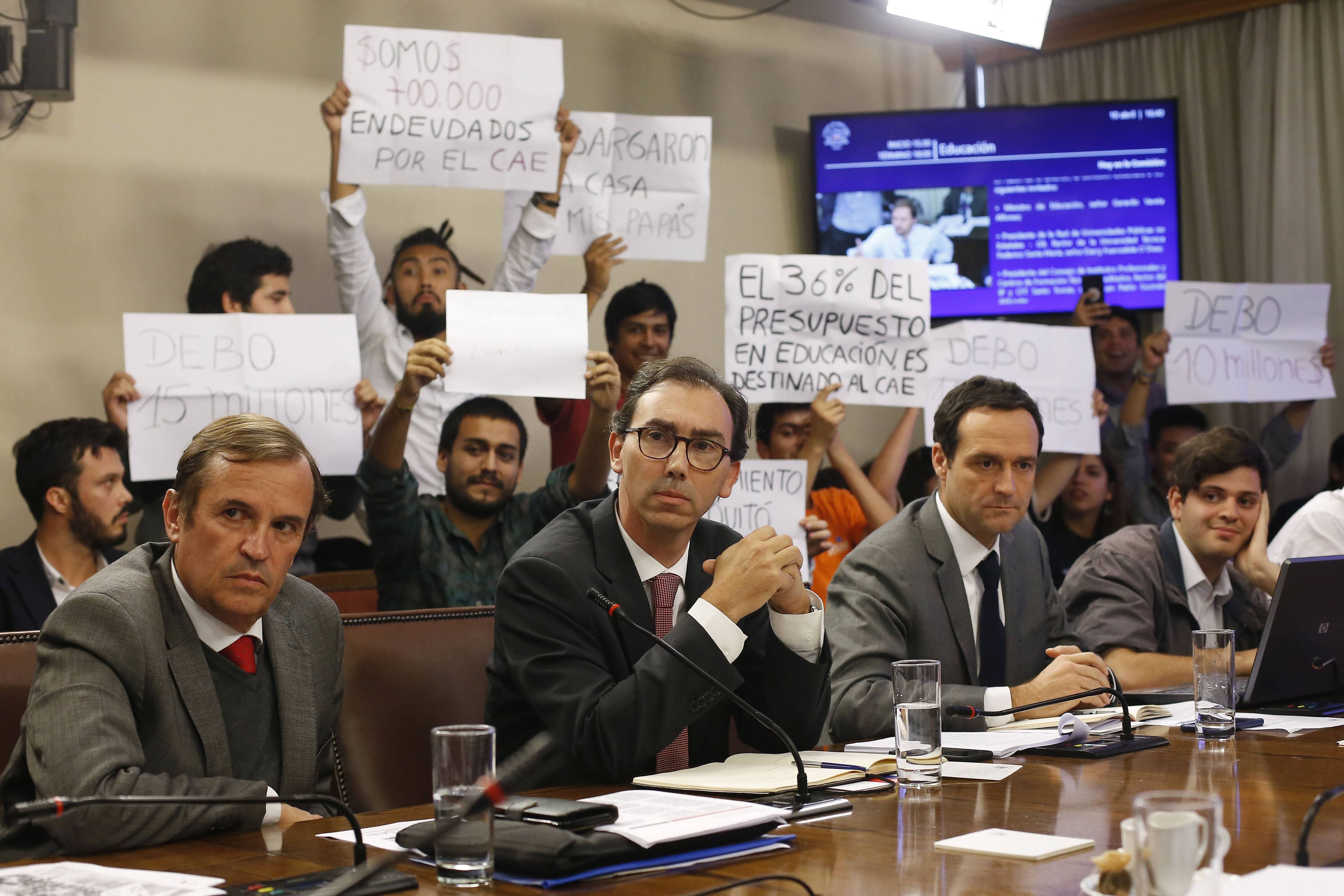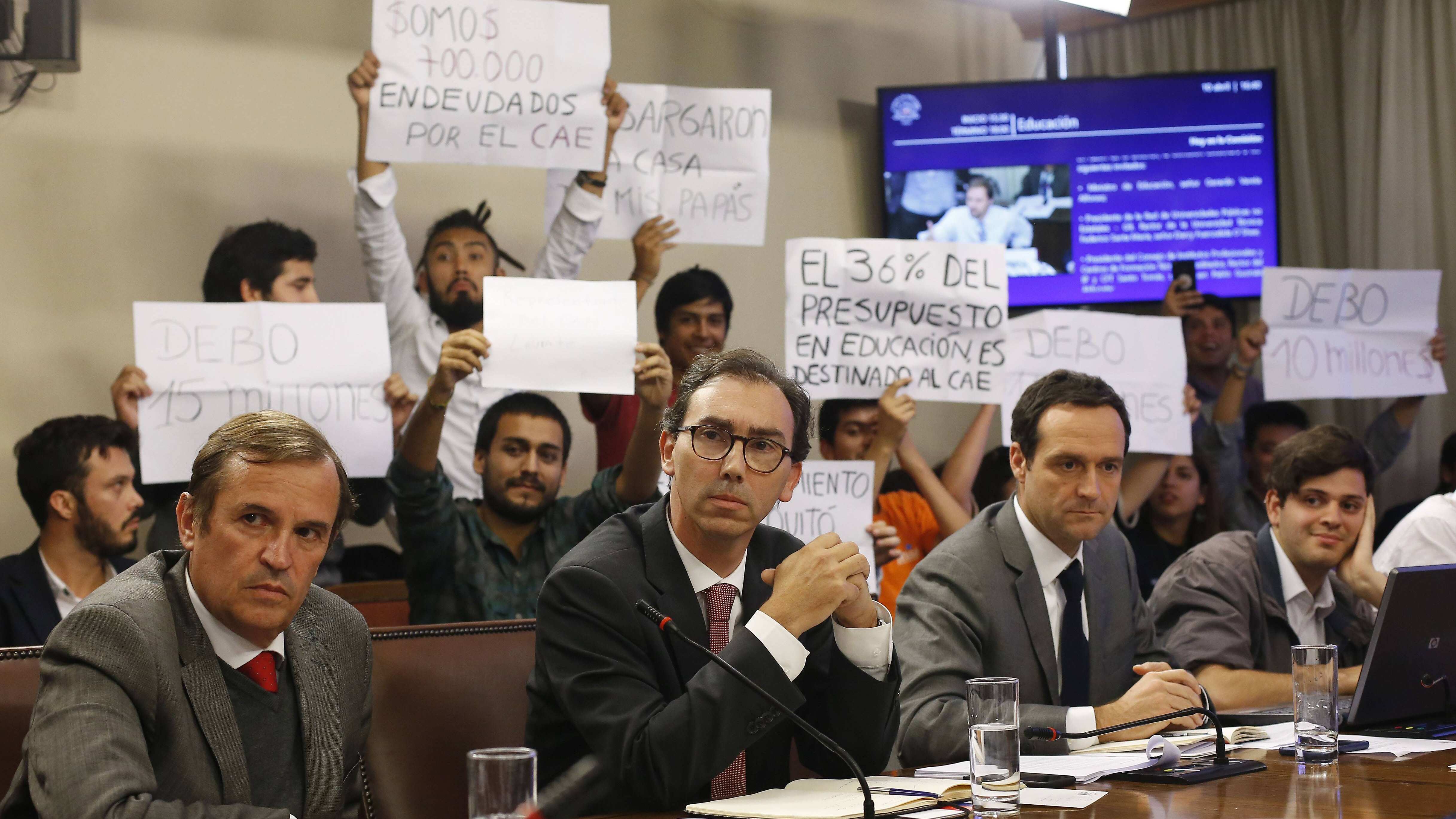 Este martes, un grupo de estudiantes se manifestó con carteles que demandaban la condonación del Crédito con Aval del Estado (CAE), durante una sesión de la Comisión de Educación.