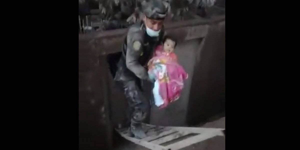 De esta manera nuestros valientes elementos de Policía Nacional Civil rescatan a una bebé, luego que el #VolcánDeFuego hiciera erupción. pic.twitter.com/leoviIMPL1