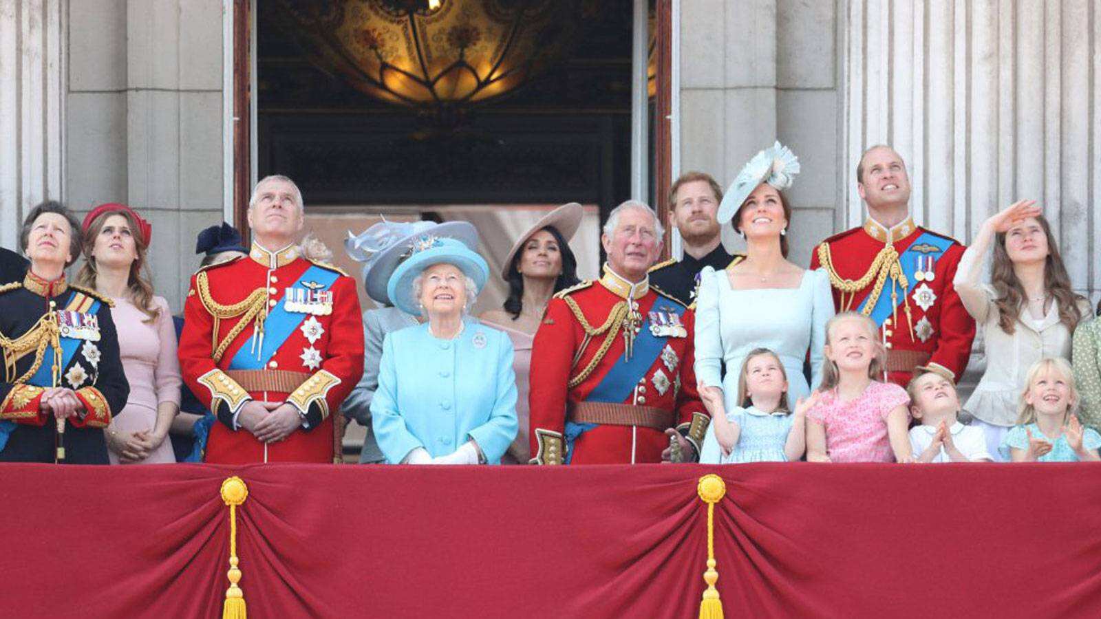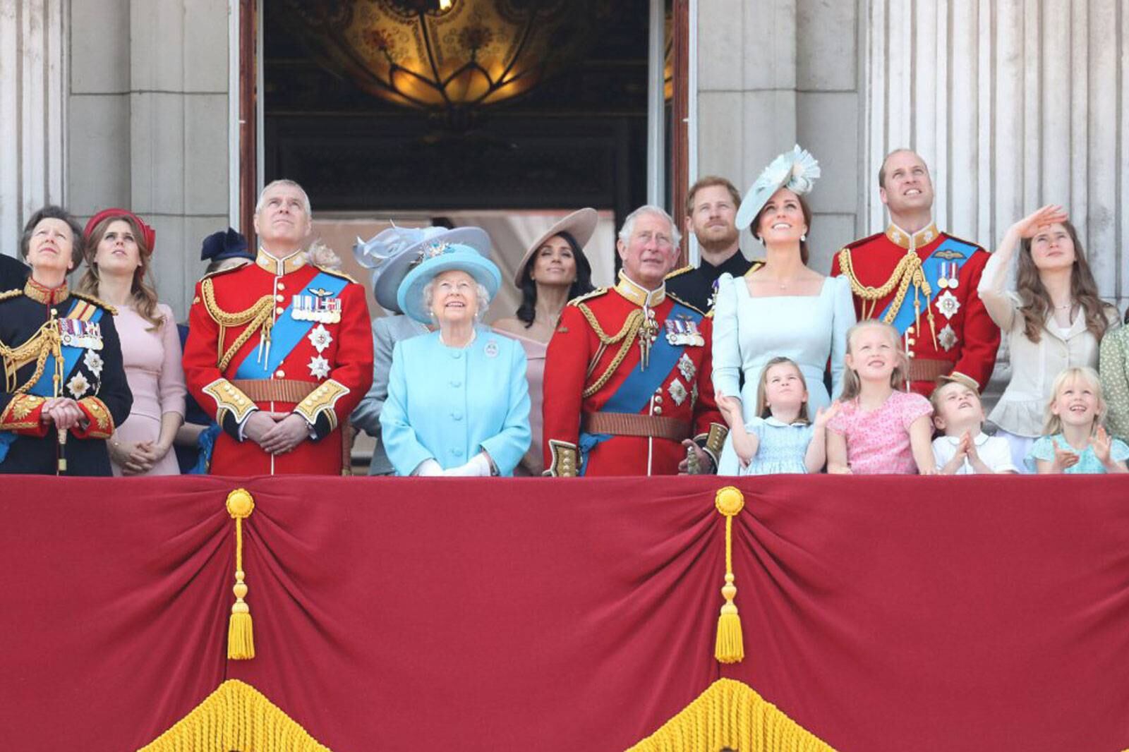 Al acabar el desfile, se desarrolló un espectáculo aéreo con aviones de las Fuerzas Aéreas (RAF) y el tradicional saludo la reina Isabel II, desde el balcón del Palacio de Buckingham, acompañada por los principales miembros de la familia real, entre los que debutó la exactriz Meghan Markle.