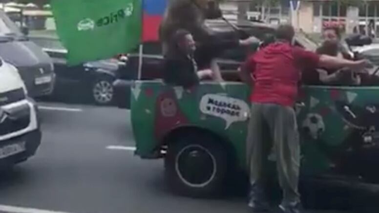 Just been sent this, appears to be a bear in a jeep, blowing a vuvuzela (?) and then giving a quenelle salute. And told it's happening somewhere in Moscow. pic.twitter.com/Tg0Hj0taSo