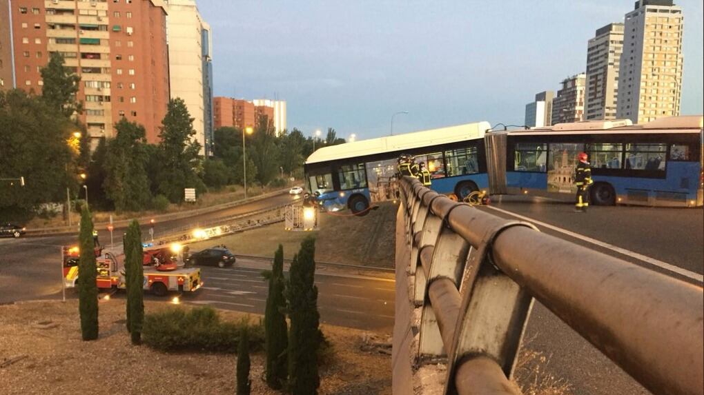 #Accidente M11. Autobús articulado de la @EMTmadrid, sin pasajeros, pierde el control, choca contra el lateral y acaba con parte del vehículo suspendido fuera del puente.@BomberosMad han rescatado al conductor pic.twitter.com/Z2QA2KguaQ