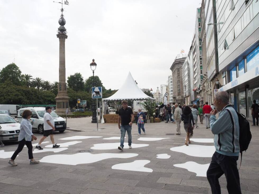 En términos prácticos, es lo mismo que los conocidos pasos de cebra, pero en vez de rayas, la pintura blanca forma manchas como las de las vacas. La idea surgió a unos 54 kilómetros al sur, en la Casa Grande de Xanceda (Mesía, A Coruña), una granja donde pastan a diario 380 vacas y cuya leche se destina desde 2005 a la fabricación de yogures ecológicos.