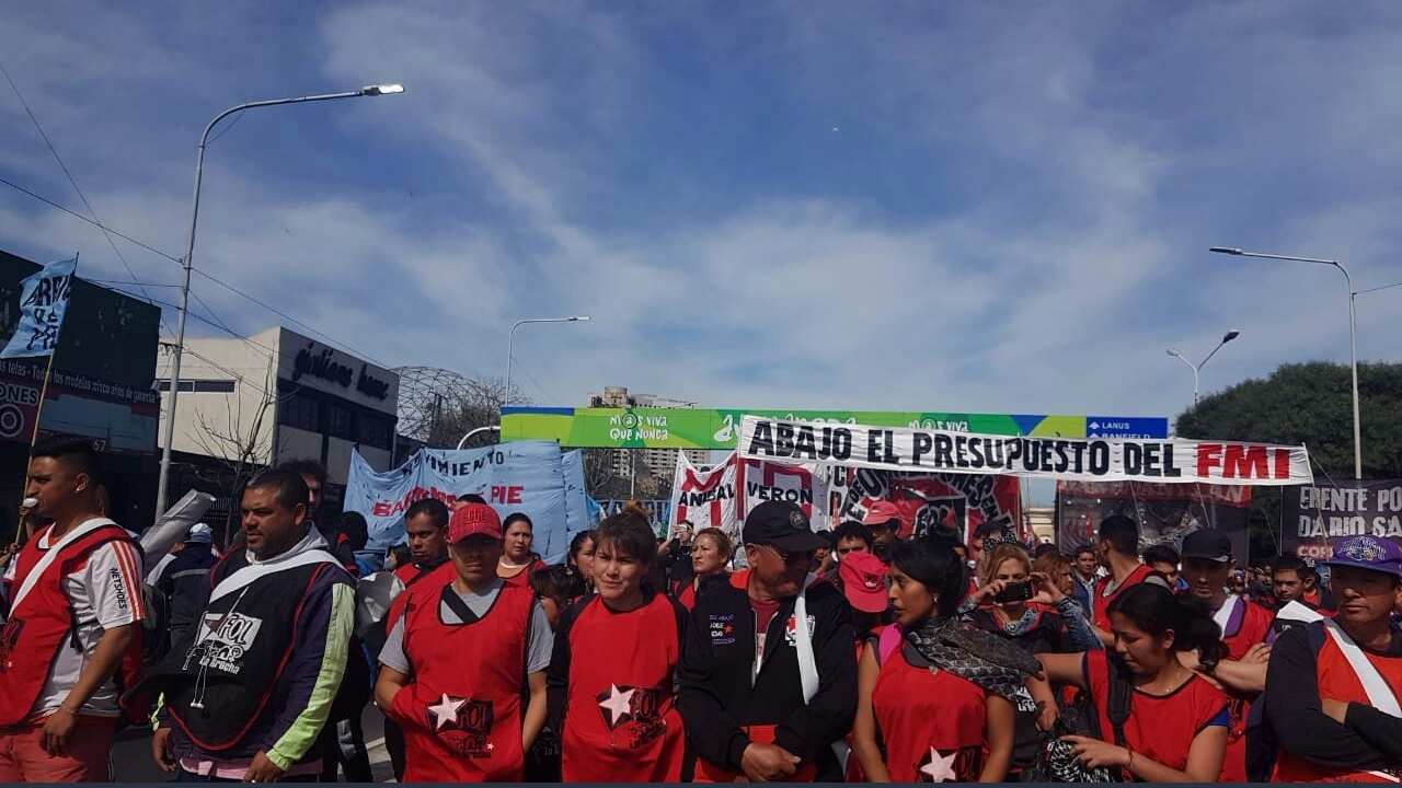 Sindicatos combativos y agrupaciones sociales y políticas se concentraban en uno de los principales accesos a Buenos Aires con pancartas que decían “Fuera FMI, basta de hambre”. Otros manifestantes se juntaban en avenidas del centro capitalino bajo consignas contrarias a las políticas de ajuste del gobierno.