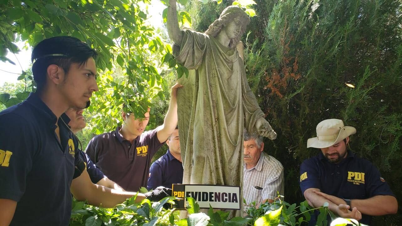 Son 10 las nuevas estatuas que fueron halladas en el fundo del empresario Raúl Schüler, ubicada en San Francisco de Mostazal en la Región de O’Higgins. Algunas son del Cementerio General, otras del Católico de Santiago y también del camposanto de Quillota. Una de ellas está hecha en hierro y tiene un costo de más de $200 millones.