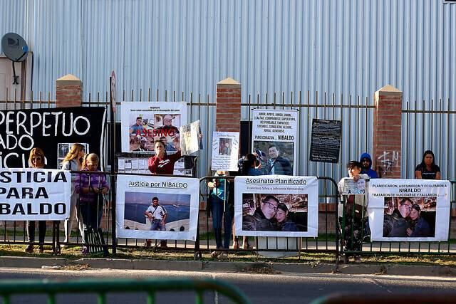 Sin embargo a la cita también llegaron más personas. Se trata de manifestantes, familiares, que exigían justicia. “Justicia para Nibaldo”. Estos eran los mensajes de los carteles que repletaron el exterior del juzgado.