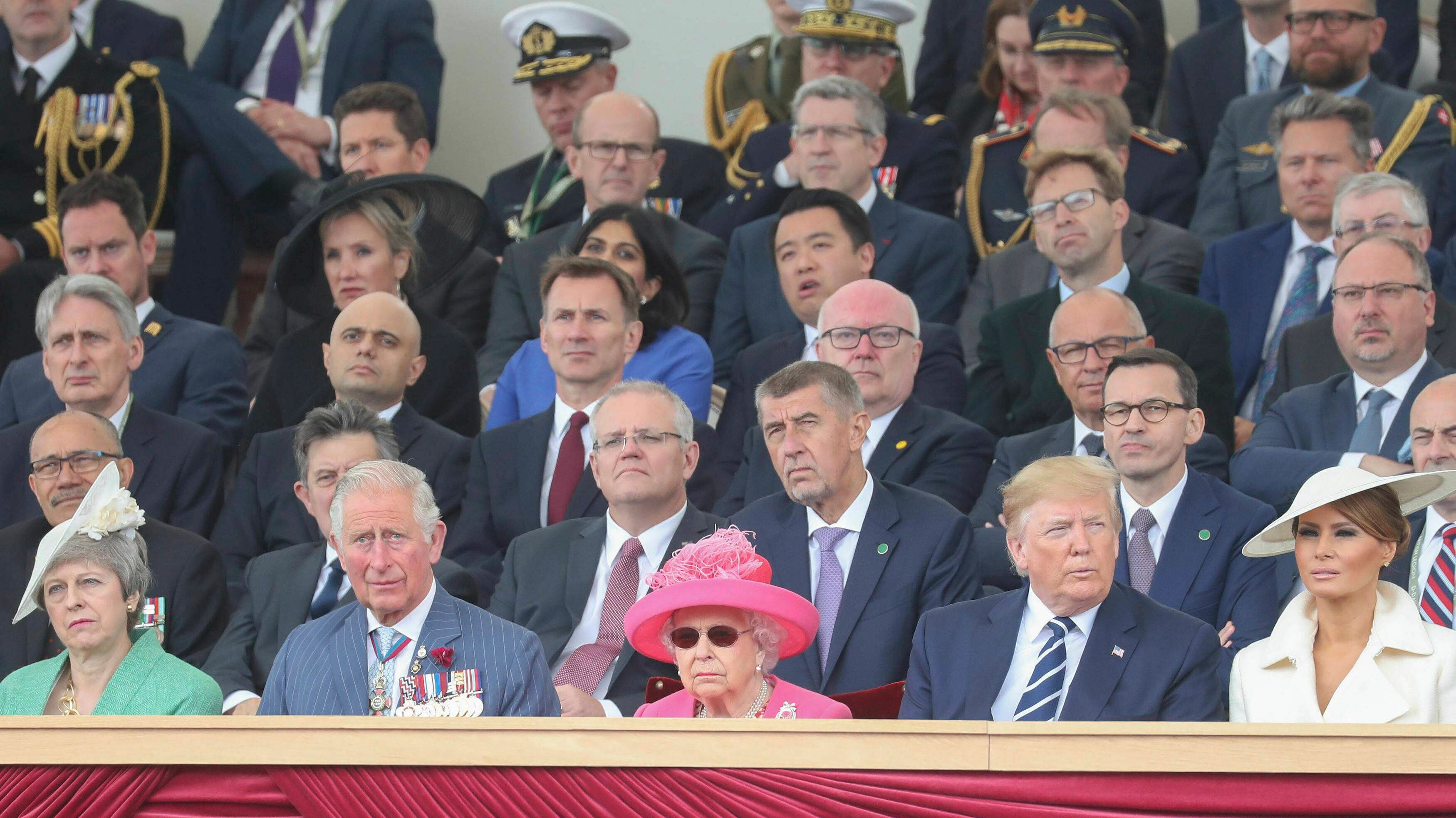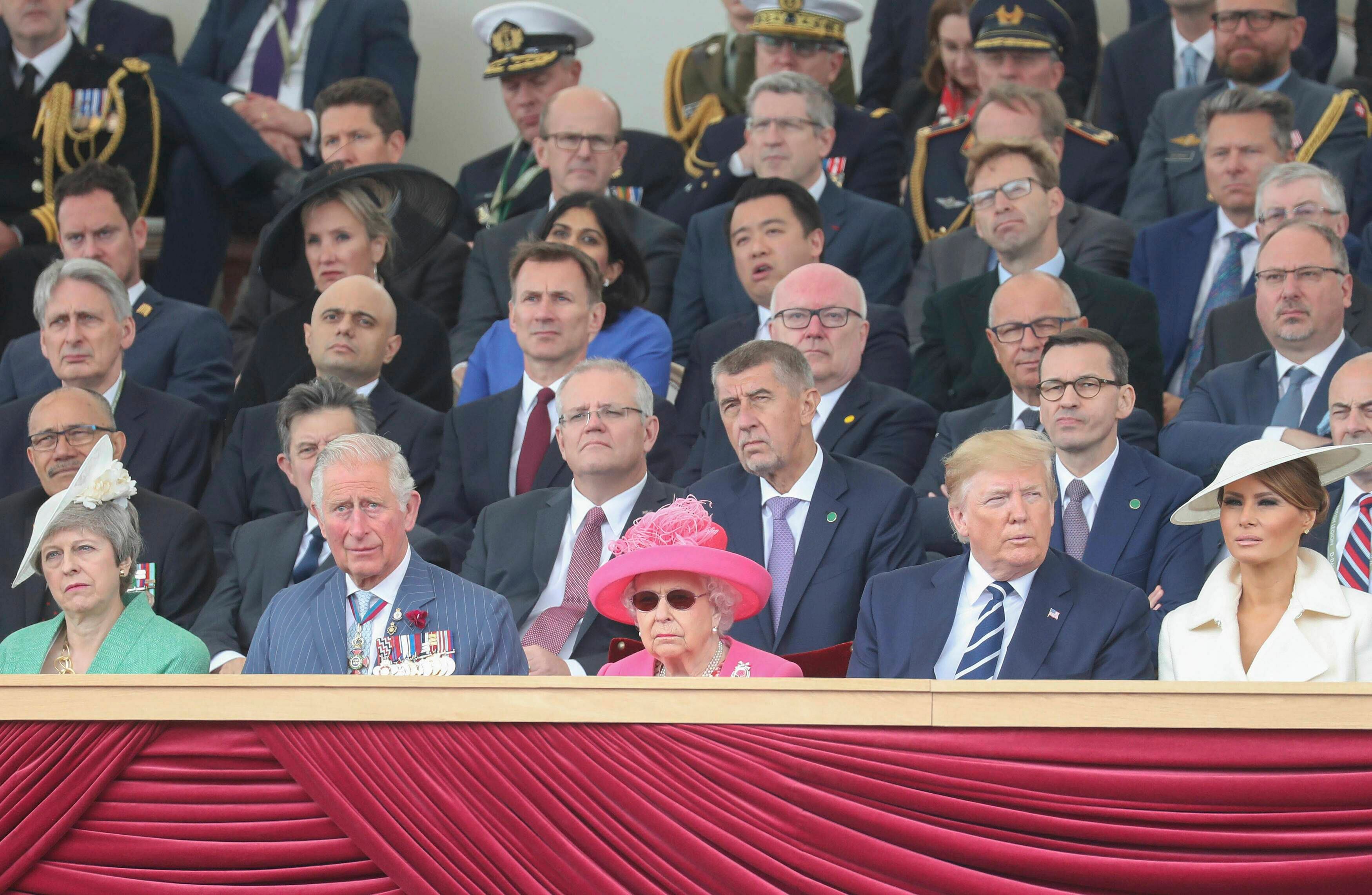 Para esta conmemoración se instaló un escenario gigante con las banderas de los países aliados en la II Guerra Mundial y la frase «Día-D 75». Además la guardia real y miembros de las fuerzas armadas hicieron una muestra de despliegue militar para dar la bienvenida a la soberana.