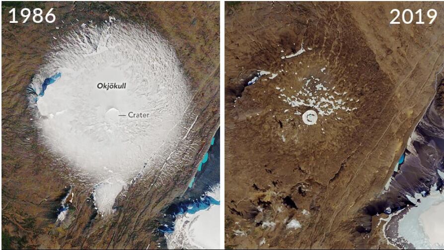 Una imagen satelital difundida por la NASA da cuenta de la gradual desaparición del enorme glaciar Okjökull (llamado por cariño Ok), que en las últimas tres décadas se fue reduciendo hasta ahora que fue declarado muerto, difunto, occiso, finado.
