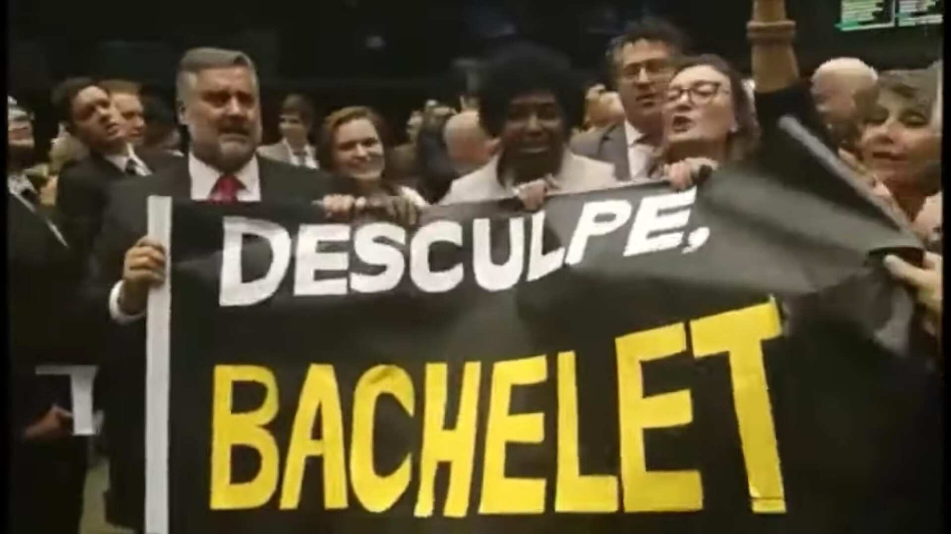 Con pancartas llegaron legisladores al Parlamento de Brasil para darle disculpas a la Alta Comisionada de la ONU para los Derechos Humanos, Michelle Bachelet, tras las agraviantes palabras de su presidente Jair Bolsonaro.