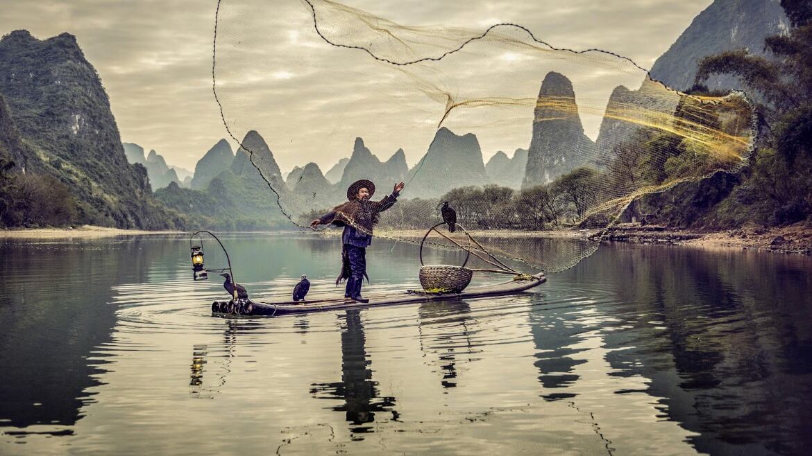 Y si hablamos de Guilin, es imposible ver una de sus señas de identidad, pescadores de cormoranes flotando en sus frágiles barcos de bambú. Estas aves son entrenadas para pescar durante al menos 8 años antes de que puedan ser utilizadas en el trabajo diario. Los lugareños salen al río al amanecer y se mueven en silencio. La oscuridad del río sólo está parcialmente rota por la tenue luz de una linterna de queroseno que permite ver la posible presa. Las aves se lanzan al agua cuando detectan a los peces y los capturan. Después, los pescadores ‘vacían’ la garganta de los animales.