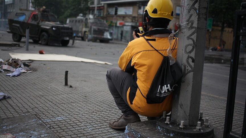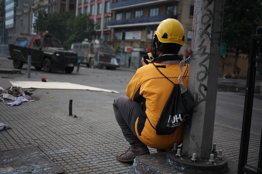 El INDH denunció a través de un video en su cuenta de Twitter lo que calificó como una “violenta e inexplicable agresión” sufrida por uno de sus funcionarios, el fotógrafo Claudio Pérez, quienes son caramente identificables con sus chaquetas y cascos amarillos.