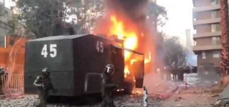 Lo más grave hasta el momento se dio por el incendio de un carro lanzaguas producto de una bomba mólotov, cerca de Ramón Corvalán con la calle Carabineros de Chile.
