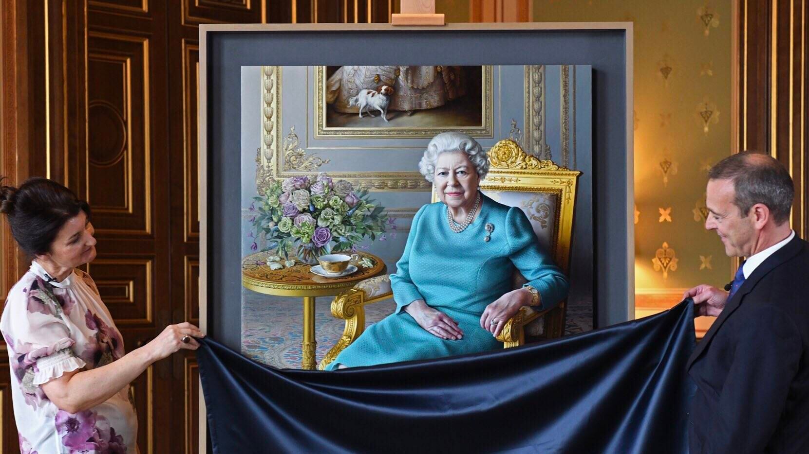 Sir Simon McDonald, subsecretario de Estado permanente para asuntos exteriores y de la Commonwealth y jefe del Servicio Diplomático, organizó la presentación virtual junto al artista en el FCO. Ambos, descubrieron el gran cuadro a tamaño natural, que estaba tapado con una tela. La Reina vio su retrato por primera vez en ese momento desde la pantalla de su ordenador. La pintura, de una evidente altísima calidad, tardó 7 meses en ser creada por su autora.