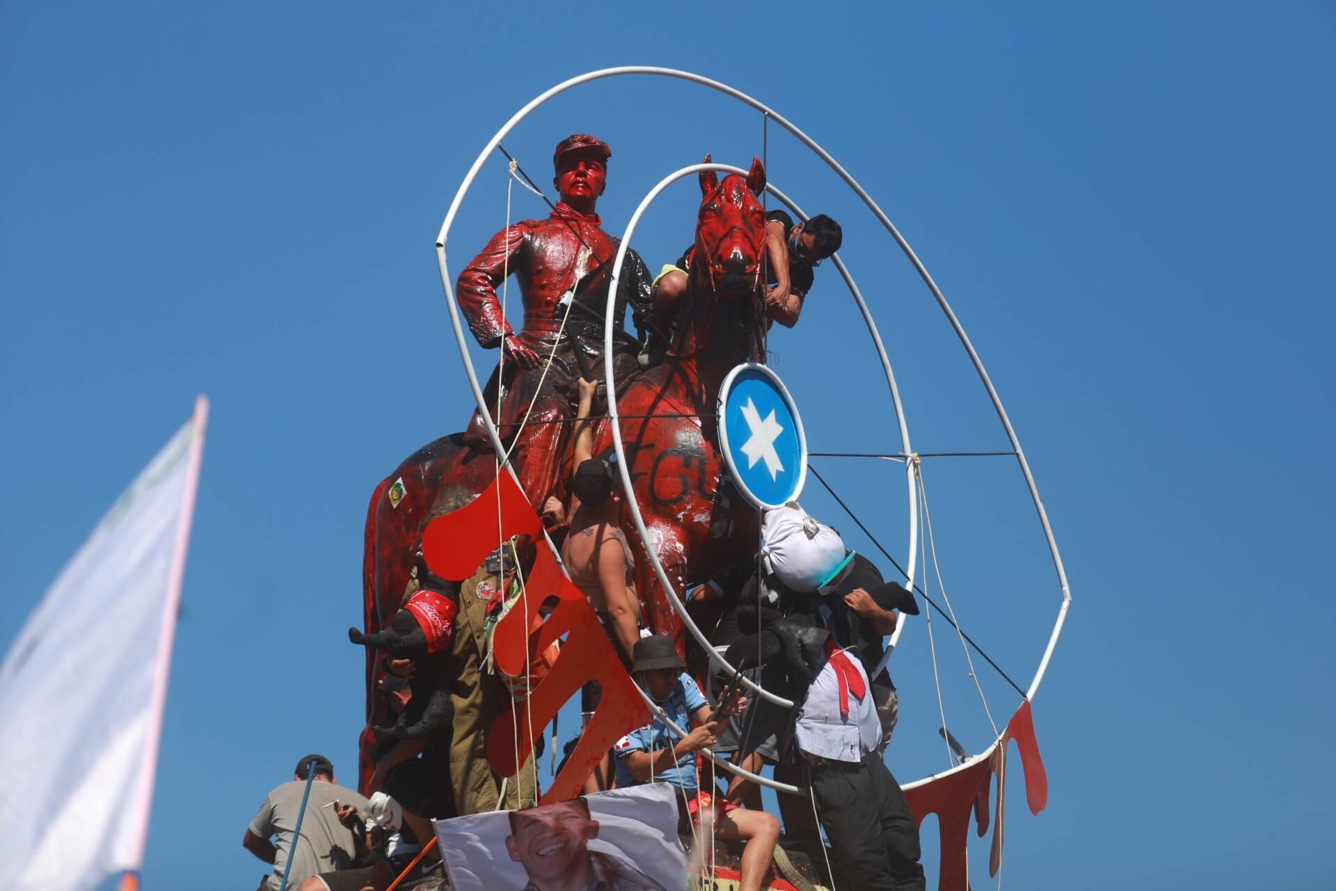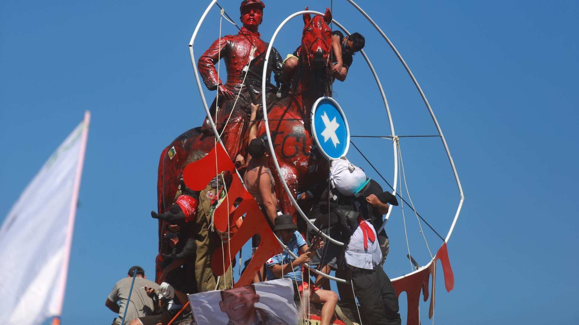 Si en la manifestación del viernes fue la pintura roja con que cubrieron la estatua de Manuel Baquedano, ahora la imagen que ha llamado la atención es la estructura que simula un ojo gigante al frente del monumento al héroe de la Guerra del Pacífico.