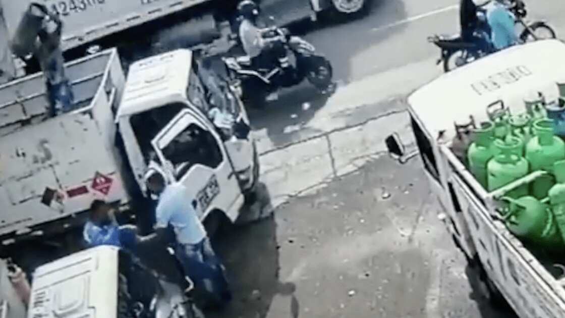 Sin embargo, no se dio cuenta que uno de ellos, quien se encontraba en la parte superior del camión de carga, tomó un cilindro de gas y se lo lanzó a la cabeza.