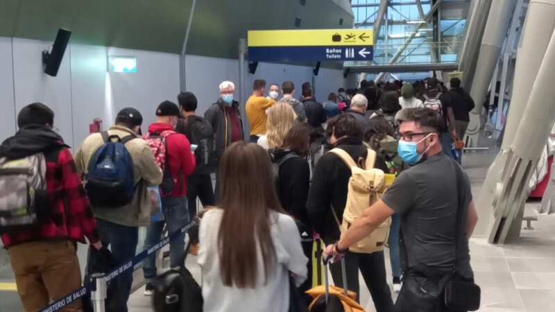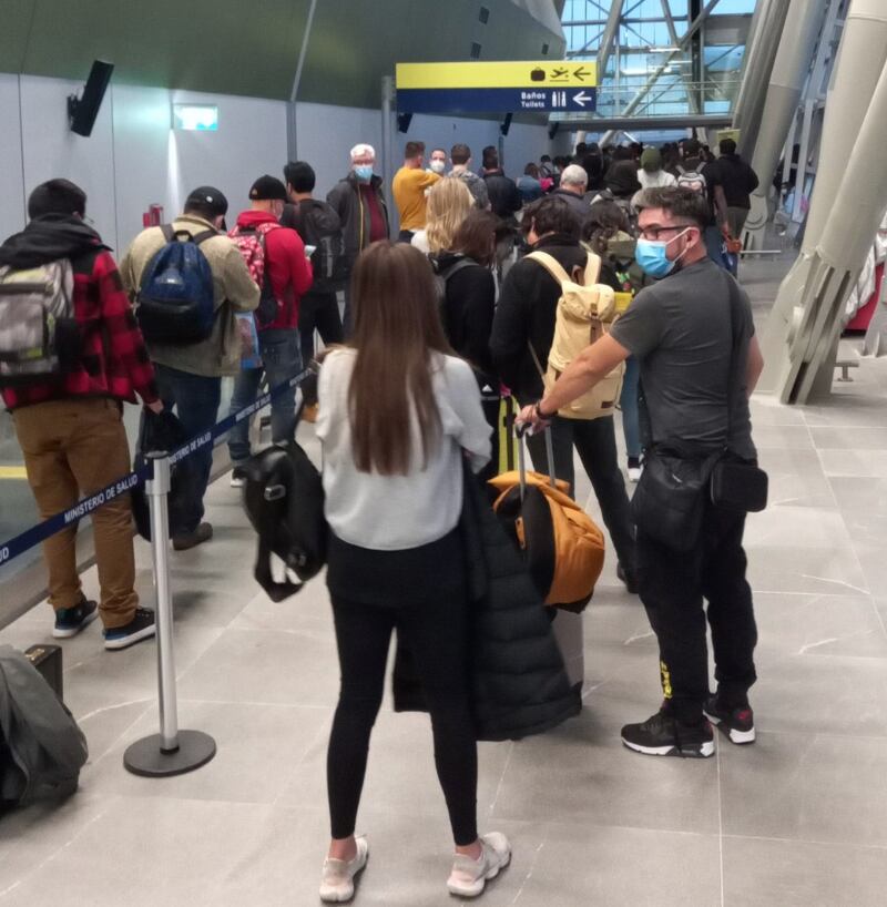 Por segunda jornada el Aeropuerto en Santiago registra imágenes de largas filas y aglomeraciones, debido a la entrada en vigencia de las normativas que indican que los pasajeros que llegan a Chile deben trasladarse a un hotel sanitario por lo menos cinco días.