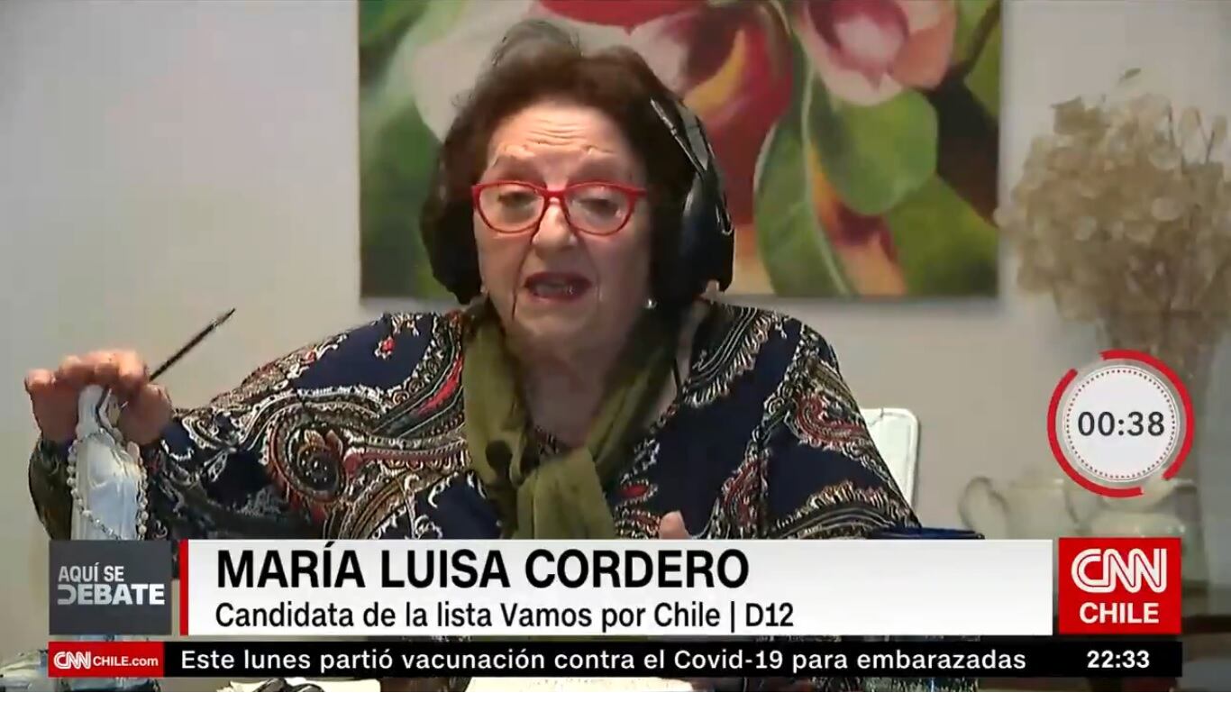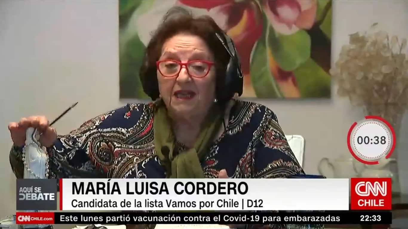 La semana pasada la candidata independiente a constituyente que va en cupo UDI Yuyuniz Navas acusó a los chinos de lanzar el coronavirus por el mundo (dijo que era una intuición que ella tenía). La noche de este lunes 26, una colega de ella que también va de independiente en esa misma lista, la doctora María Luisa Cordero, tuvo una aparición tanto o más polémica en “Aquí se debate” de CNN. Cordero es candidata a constituyente por el distrito 12.
