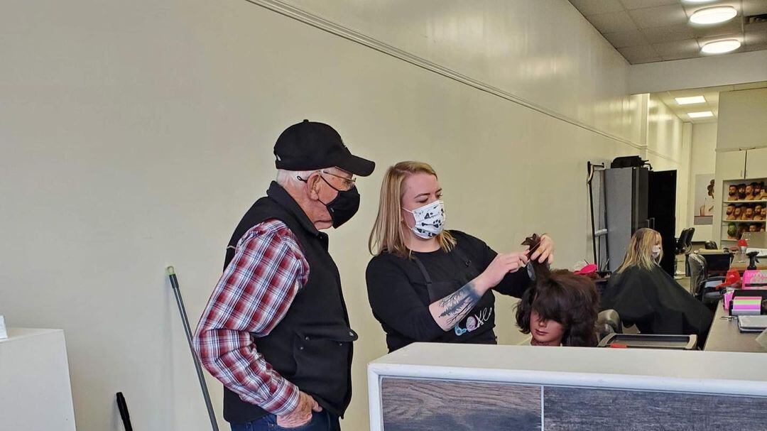 Un adulto mayor fue a una peluquería a aprender a rizar el pelo, porque su esposa ya no puede hacerlo.