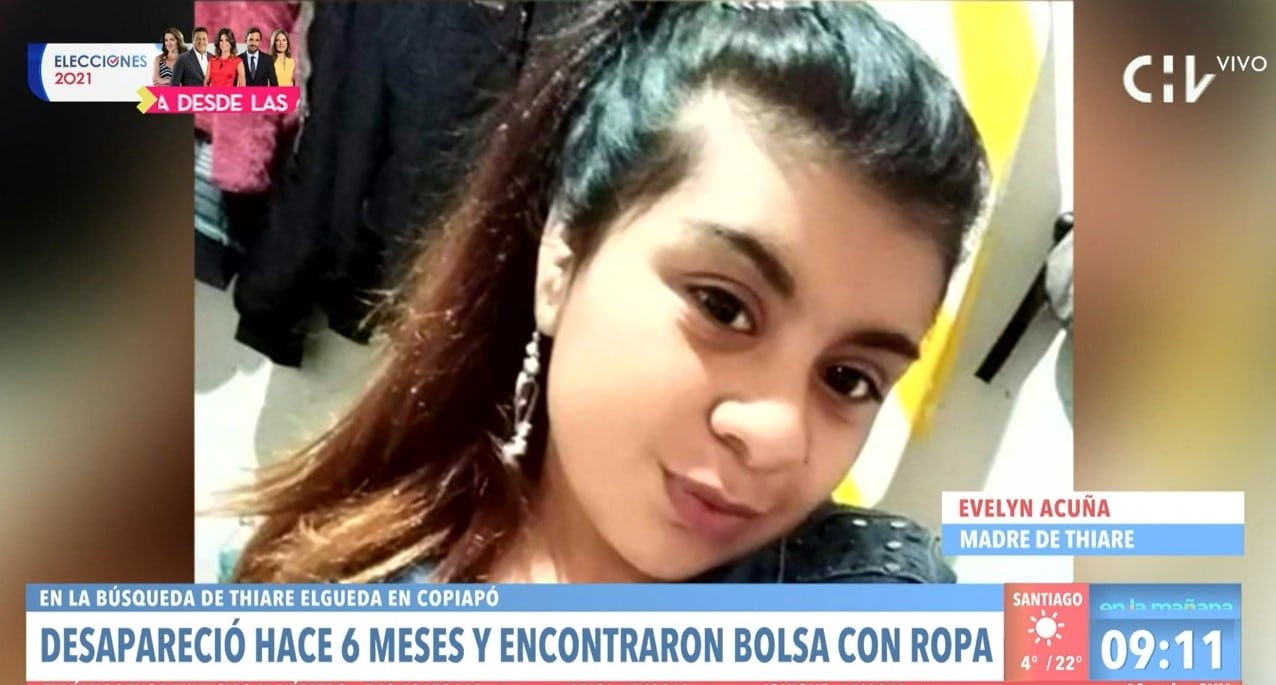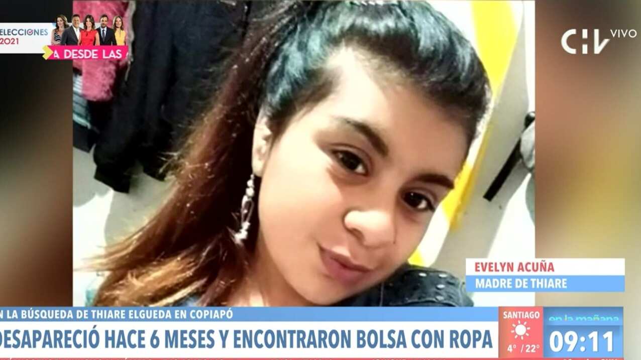 Evelyn Acuña, madre de la mujer de 22 años desaparecida hace seis meses en Copiapó, Thiare Elgueda, dio esta mañana en el programa de CHV «Contigo en la mañana» su teoría respecto del hallazgo que este fin de semana realizaron en la Segunda Región, la Fiscalía de Atacama y Brigada de Homicidios de la Policía de Investigaciones (PDI), con las ropas de la joven.