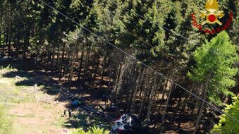 Fotos del suceso tomadas por los bomberos muestran los restos retorcidos del teleférico en un escampado cerca de pinos, próximo a la cima del Monte Mottarone, cerca del Lago Maggiore.