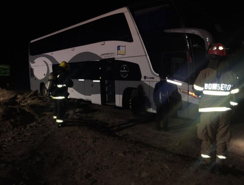 La máquina, que iba desde Sierra Gorda hasta Iquique con 35 pasajeros, sufrió un accidente que casi terminó en tragedia, luego que el chofer se saliera de la Ruta 5 Norte y terminara chocando con unas piedras que provocaron que se dañara el estanque de combustible.