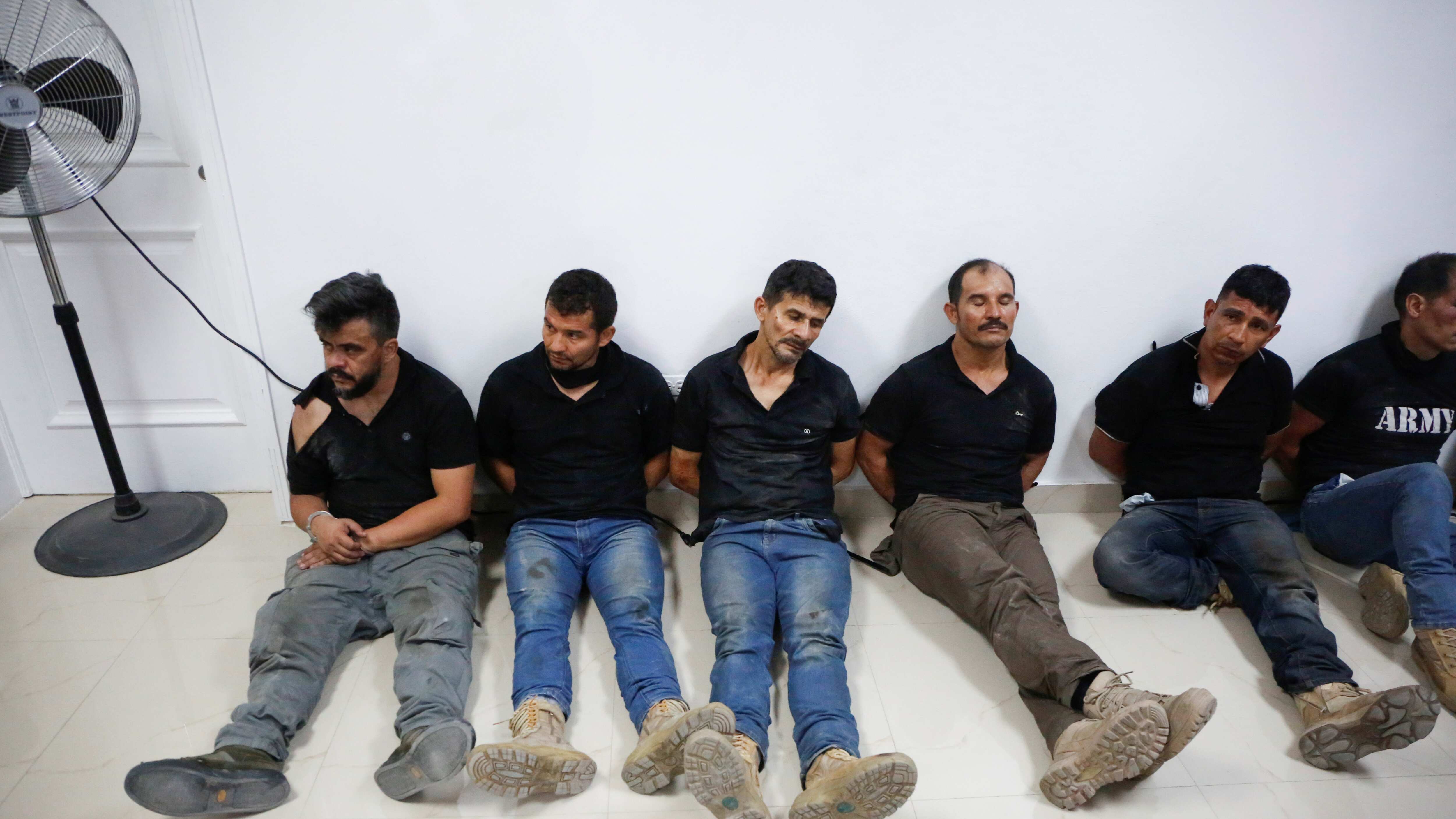 El jefe de policía León Charles hizo desfilar a 17 hombres ante periodistas, mostrando varios pasaportes colombianos, además de rifles de asalto, machetes, radios de comunicación de doble vía y materiales, incluidos cortadores de pernos y martillos.